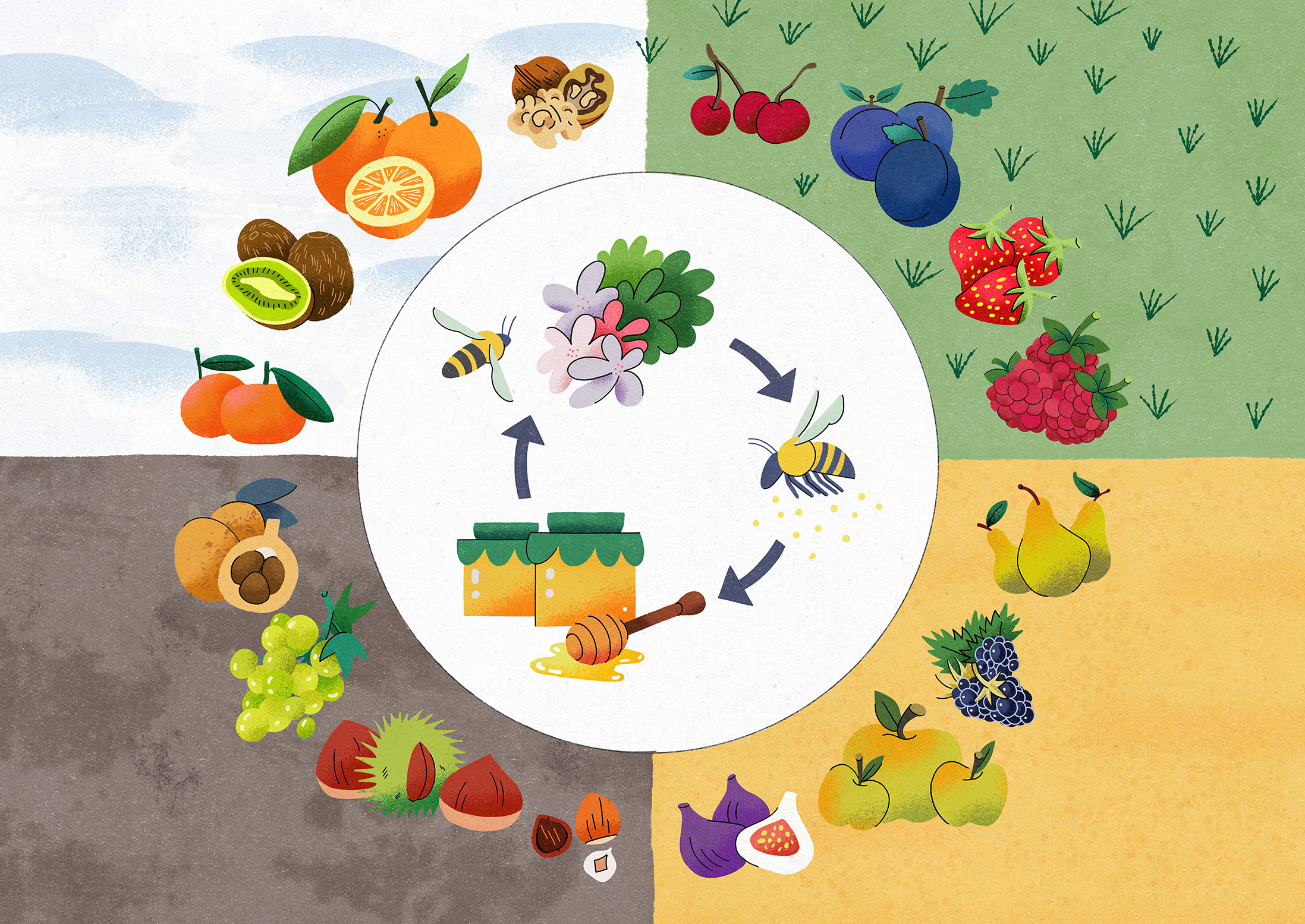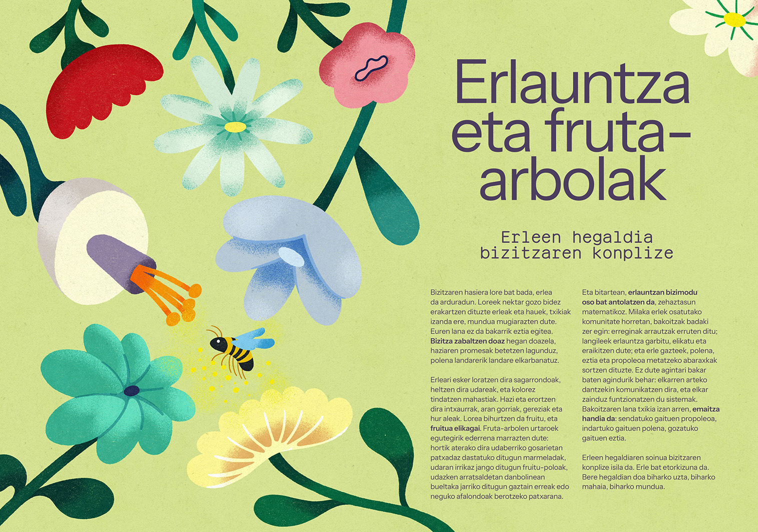 Erletxo experimenta por primera vez el mundo exterior del enjambre, entendiendo cómo las flores se transforman en frutas y cómo funciona la polinización, mientras sus hermanas y hermanos hacen miel en casa.